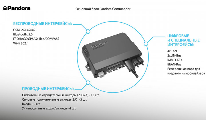 Дополнительно Pandora Commander Фирменный оснащена двумя интерфейсами LIN, портом IMMO-KEY и шиной BEAN BUS, что расширяет совместимость с различными архитектурами автомобилей. Для реализации сложных индивидуальных установок предусмотрен расширенный набор подключений — 20 программируемых выходов и 14 входов.